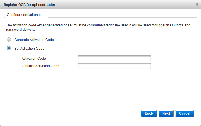- To define a specific code, select Set Activation Code, and then enter and confirm the required code and click Next.