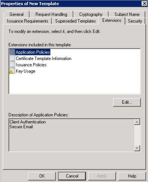 Return to the Extensions tab and, in the Extension included in this template section, select Key Usage and click Edit.