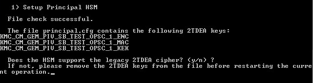 • New HSMs might not support 2TDEA keys: when importing the principal.cfg, KMS will read the file to check if there are 2TDEA keys in the file. If such keys are present, the following prompt will appear: