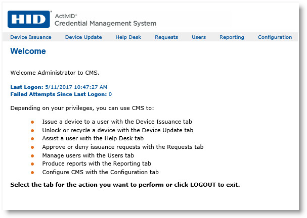 This section presents an overview of the ActivID CMS Operator Portal interface. The ActivID CMS Operator Portal consists of tabs and sub-tabs that you will use to perform device and card management procedures.