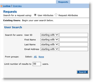 Search for a user by attribute (User ID, First Name, Last Name or Email Address) or from a user group.
