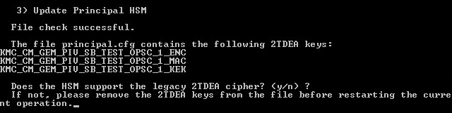 Note: New HSMs might not support 2TDEA keys: when importing the principal.cfg, KMS will read the file to check if there are 2TDEA keys in the file. If such keys are present, the following prompt will appear: