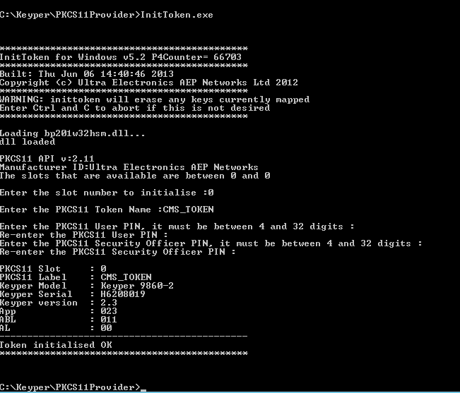 Navigate to the directory where you installed AEP Keyper HSM. By default, the directory location is C:\Program Files\AEPKeyper and run InitToken.exe.