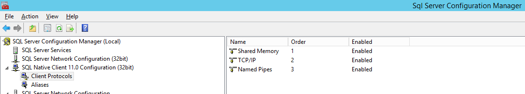 Click SQL Native Client 11.0 Configuration, and then click Client Protocols. Note: Select 32-bit or 64-bit as per your configuration.