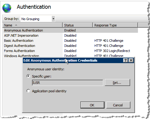 In the Authentication page, right-click to display the shortcuts menu, and then click Edit Anonymous Authentication Credentials. The Edit Anonymous Authentication Credentials dialog appears.