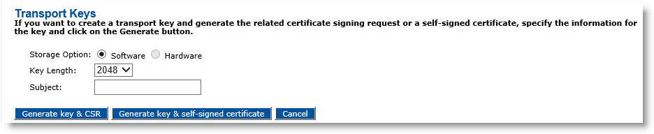 In the Certificate Authorities panel of the page, click Manage Transport Keys. The Transport Keys page appears.