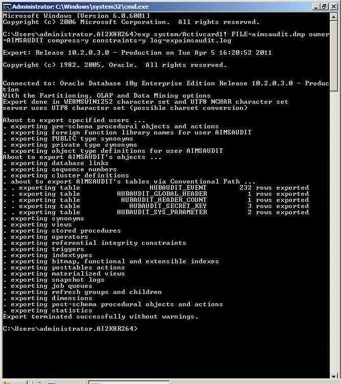exp system/activcard FILE=aimcti.dmp owner=AIMSCTI compress=y indexes=y constraints=y log=expaimscti.log