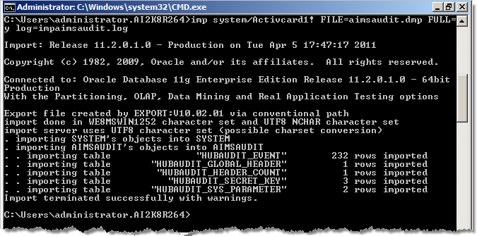 imp system/activcard FILE=aimsuser.dmp FULL=y log=
