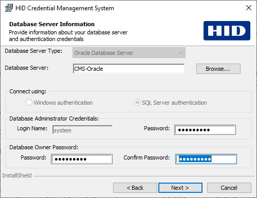 Under Database Owner Password, enter the password and confirmation password. This password is used by the ActivID CMS to connect to its six databases.