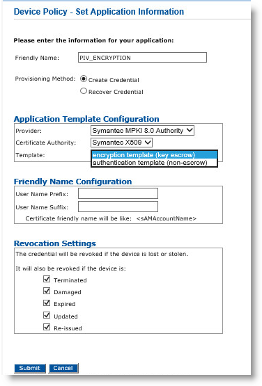 For Template, select either encryption template (key escrow) or authentication template (non-escrow) per your requirements. The encryption template allows key escrow.