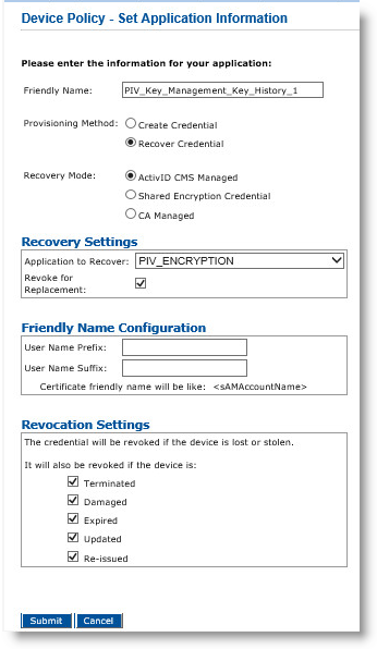 Note: Selecting the Create Credential option is the equivalent of setting the former Recover Application option (available in previous ActivID CMS versions) to No.-