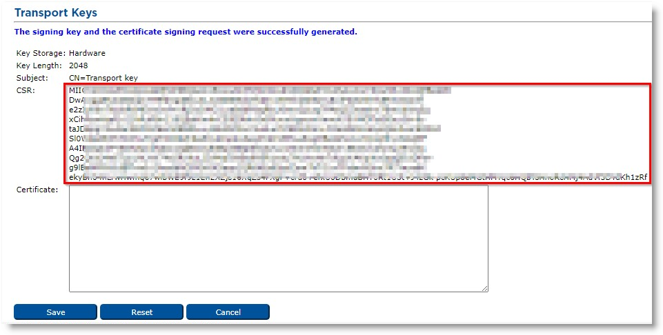 Important: Copy the CSR and paste it into a file. You need to keep this file as it will be required in order to update your transport key. -
