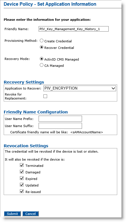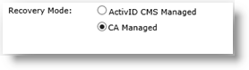 You must configure these PKI applications with the CA Managed option only. Once a card is issued with this device policy, all the user encryption certificates are stored in the ActivID CMS database, and you can recover them in the “standard” way, if necessary.