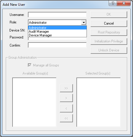 Click Root Repository to limit the rights of a Device Manager (so that they can store initialized devices only in a particular device repository). For more information, see Managing Repositories.