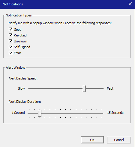 Each selection generates a pop-up window whenever the Validation Client encounters a certificate with the corresponding response status. Selecting Good typically generates a large number of notifications, so you may prefer to log Good response information if you need a record of it.