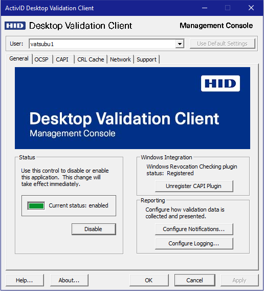 Click the button below this status indicator to change the operating state of the Validation Client. The button changes between Enable and Disable depending on the current operating state. This setting takes effect immediately and does not require that you click OK.