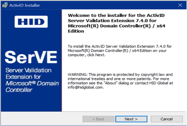 Launch the installer by double-clicking the SerVE for Microsoft Domain Controller x64.msi application included in the download.