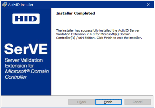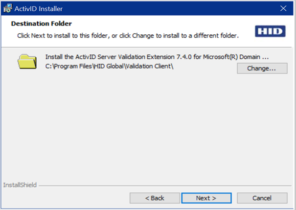 Select the installation directory for the SerVE for Microsoft Domain Controller software. The default choice is C:\Program Files\HID Global\Validation Client.