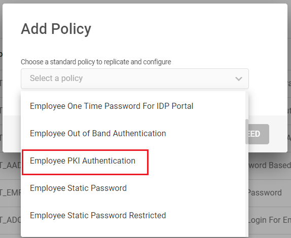From the drop-down menu, choose a standard PKI authentication policy to replicate for the newly created authentication policy, and then click PROCEED.