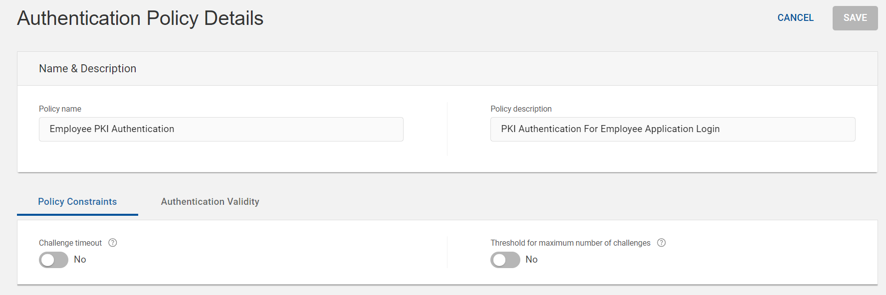This section describes the Policy Constraints tab parameters, which are related to number of challenges and its validity for this PKI authentication policy.