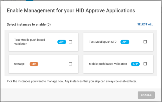 Important: If any HID Approve instances haven’t been transitioned to Factory Management, a notification will appear in the HID Approve Authentication Configuration section to enable them.