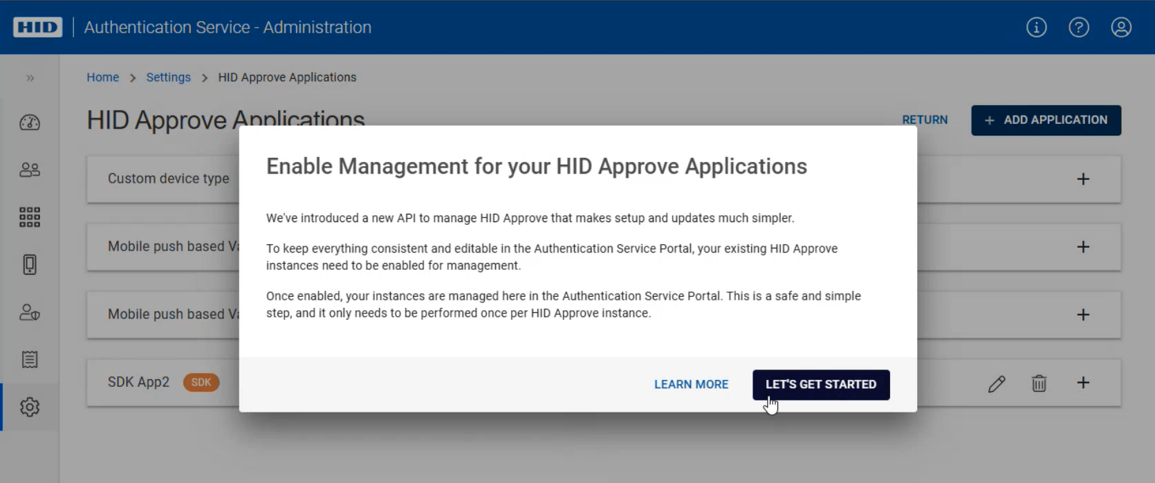 Once "Enable Management for your HID Approve Applications" pop-up appears, click on LET'S GET STARTED to start transitioning HID Approve to Factory Management.