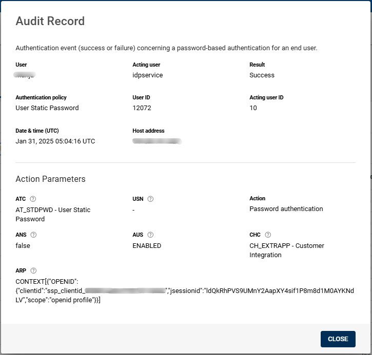 Click on the row of an audit record to open the Audit Record pop-up box and view the detail parameters for that audit record. The screenshot shown below is an example of an audit record.