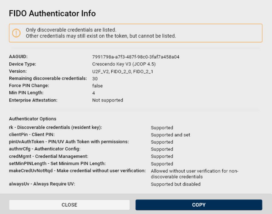 For a detailed explanation of the data shown in the FIDO Authenticator Info dialog, refer to the official FIDO Alliance documentation.