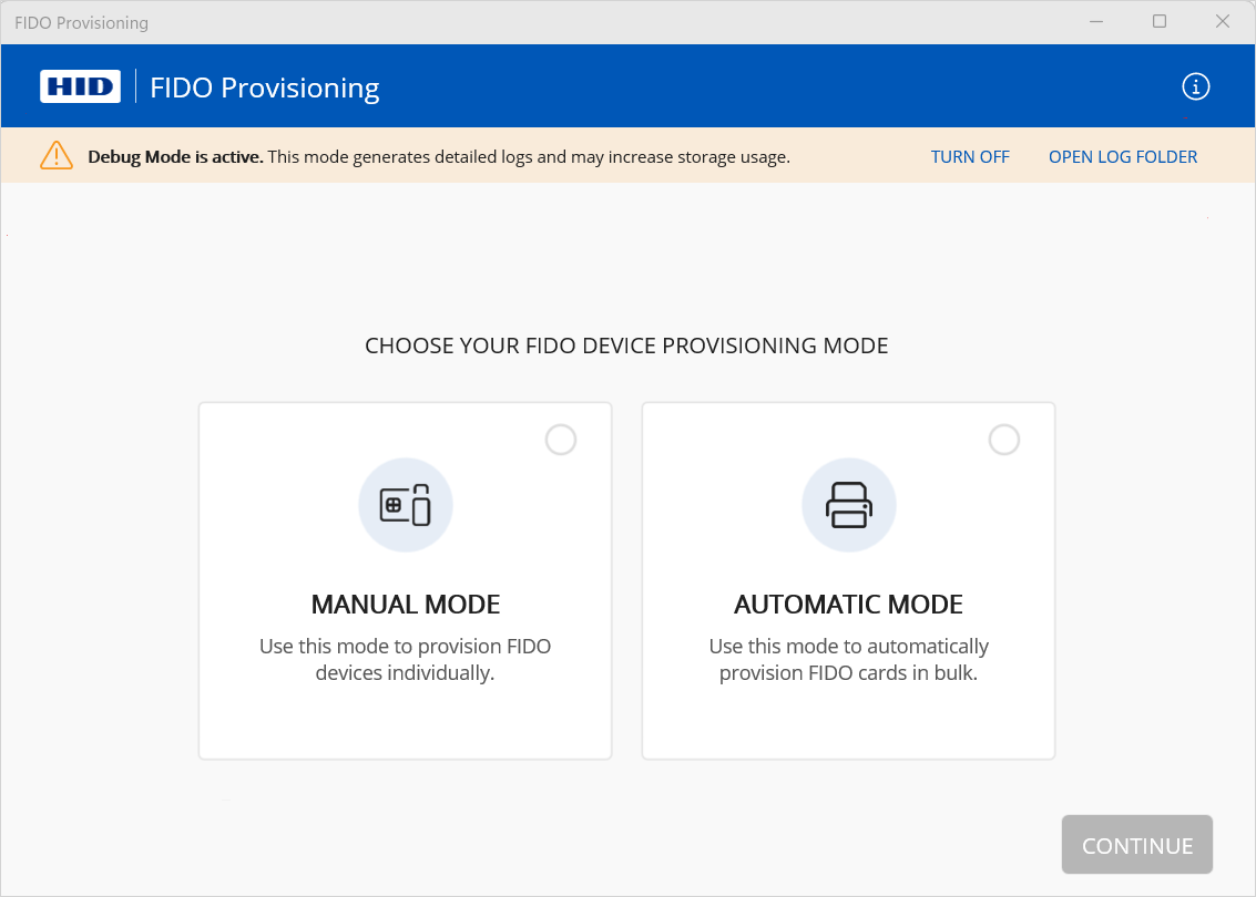 Note: The troubleshooting notification is only displayed when the Debug mode is activated.The log file, fidoprov.log, will be created in the C:\ProgramData\HID Global\FIDO Provisioning folder.