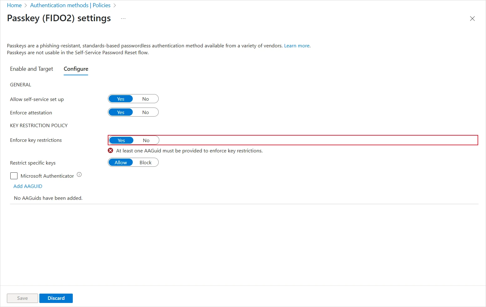Section Setting Description GENERAL Allow self-service set up Set to Yes Enforce attestation Set to Yes if your organization wants to ensure that a FIDO2 security key model or passkey provider is genuine KEY RESTRICTION POLICY Enforce key restrictions Set to Yes only if your organization wants to only allow or disallow certain security key models or passkey providers (identified by their AAGUID) Restrict specific key Set to Allow only if your organization wants to only allow or disallow certain security key models or passkey providers (identified by their AAGUID) Important: If you change key restrictions and remove a previously allowed AAGUID, users who have registered an allowed device will no longer be able use it to sign in. -
