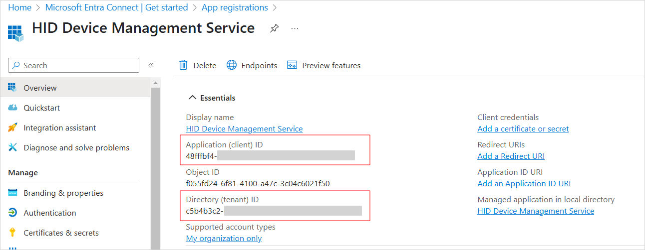 Application (client) ID - the unique identifier that Microsoft Entra ID assigned to your Device Management application when you registered it