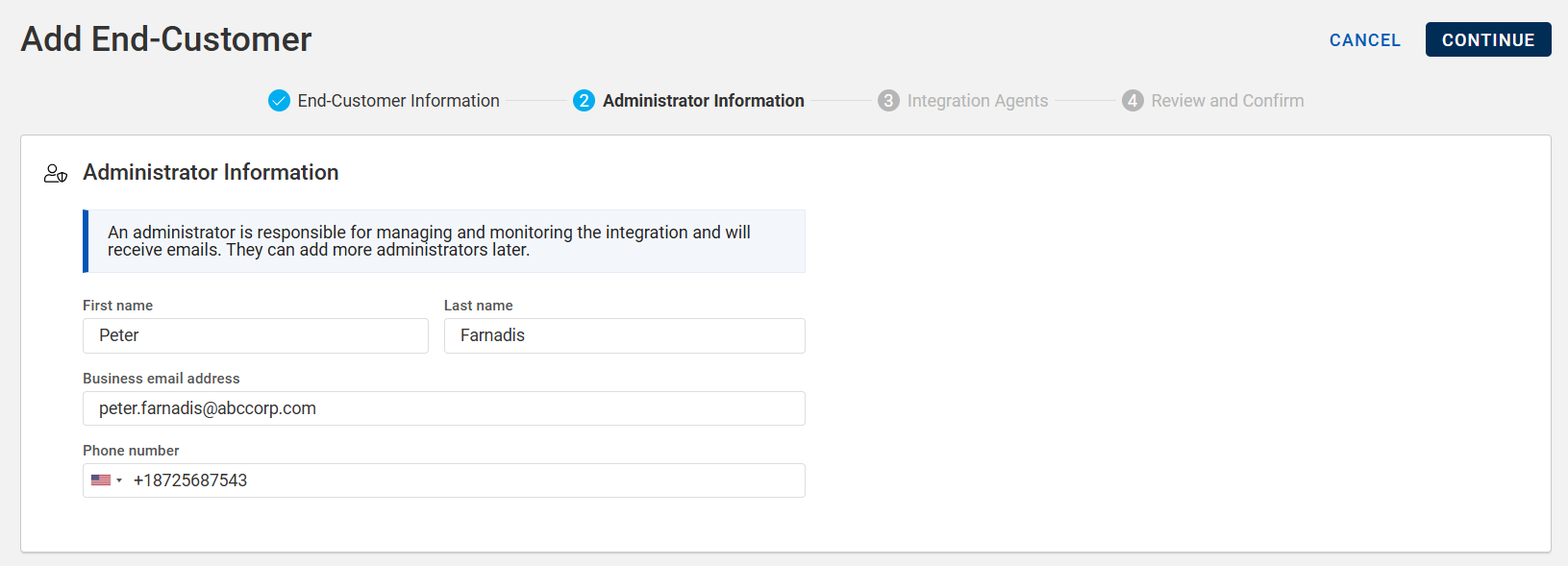 Note: End-Customer Administrators need to know details on PACS infrastructure and local topology where agent is being installed, and they should also have a general understanding of IT systems and networks. They are typically part of end-customer's IT team or may be affiliated with a Partner's or Integrator's professional services team.Enter the end-customer administrator details in the fields shown below and click CONTINUE.