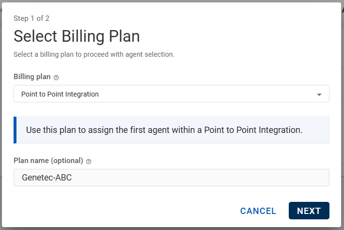 The 'Select Billing Plan' pop-up will appear. Select a billing plan from the drop-down based on your requirements, then click NEXT to proceed with agent(s) selection.