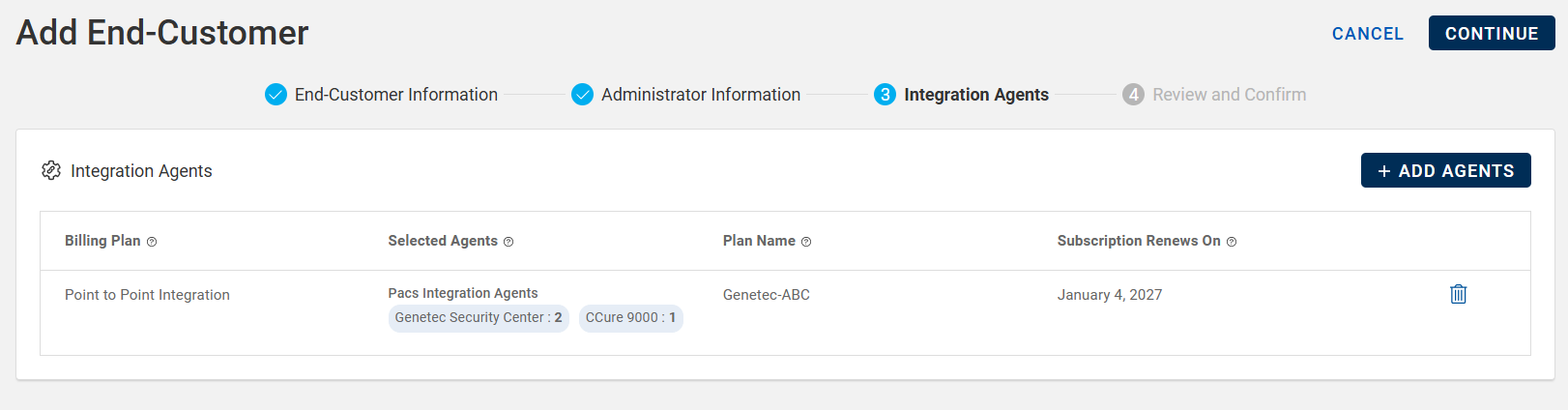 Now, the selected billing plan along with the agent(s) will be listed in the Integration Agents list. Then, click CONTINUE.