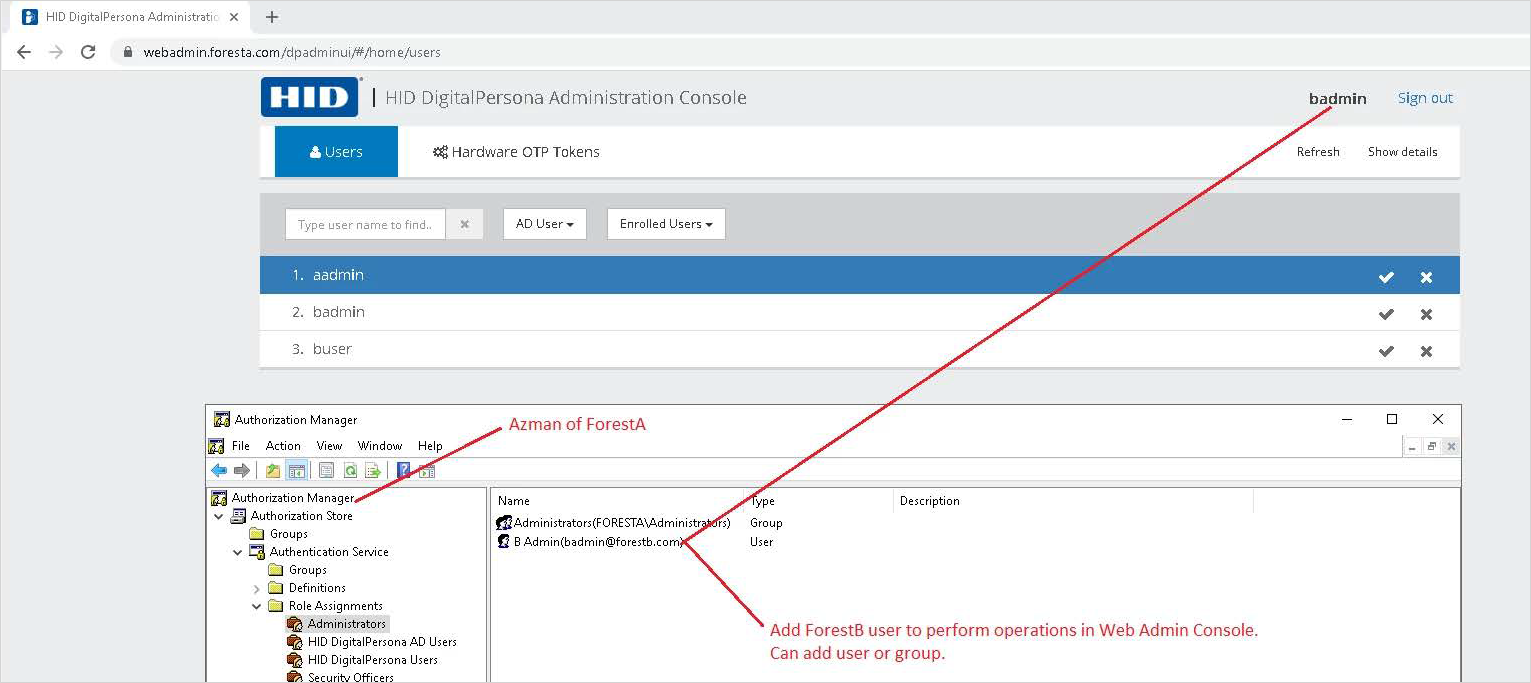 AzMan authorization for a ForestB user to perform actions and operations in the (Web) HID DigitalPersona Administration Console: