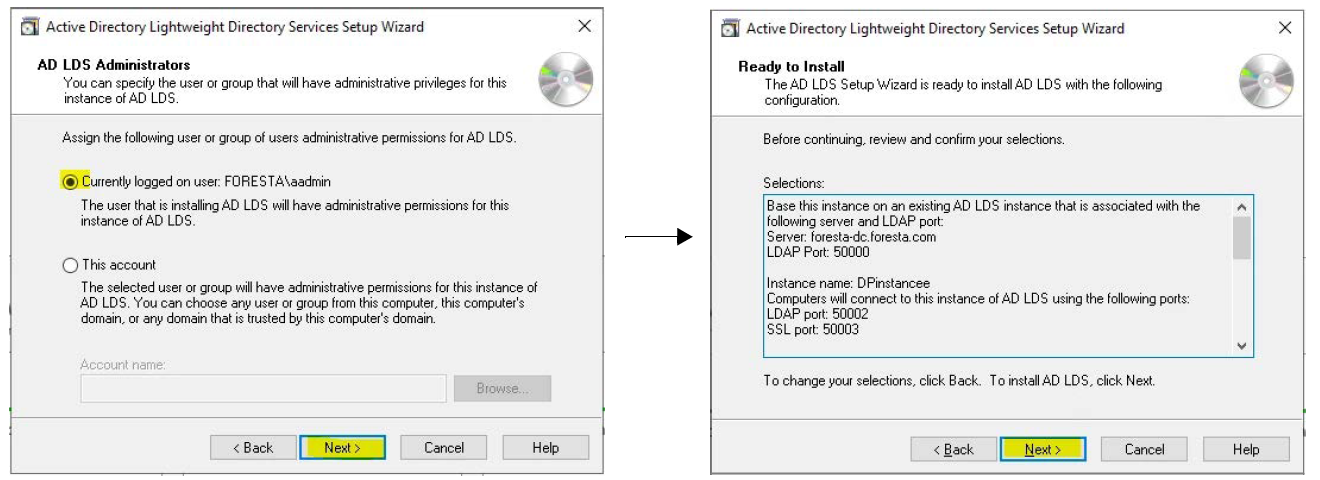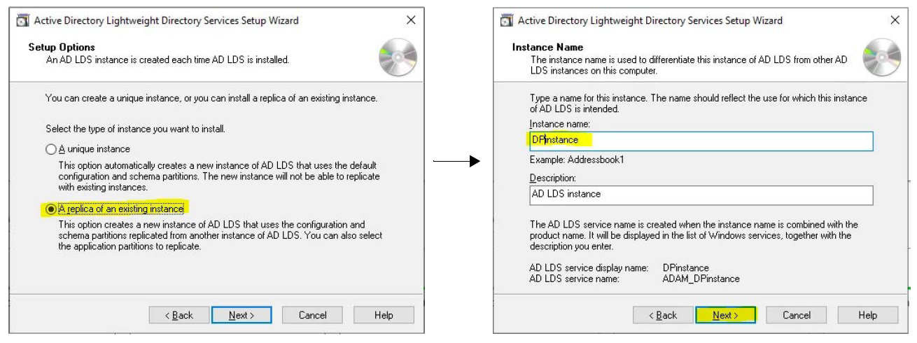 Deploy Microsoft LDS on the machine. During deployment, create a new LDS Instance (using the Domain Admin user- for example, admin@ForestA.constoso.com with an instance name such as "DPInstance". Make a note of the LDAP port#.