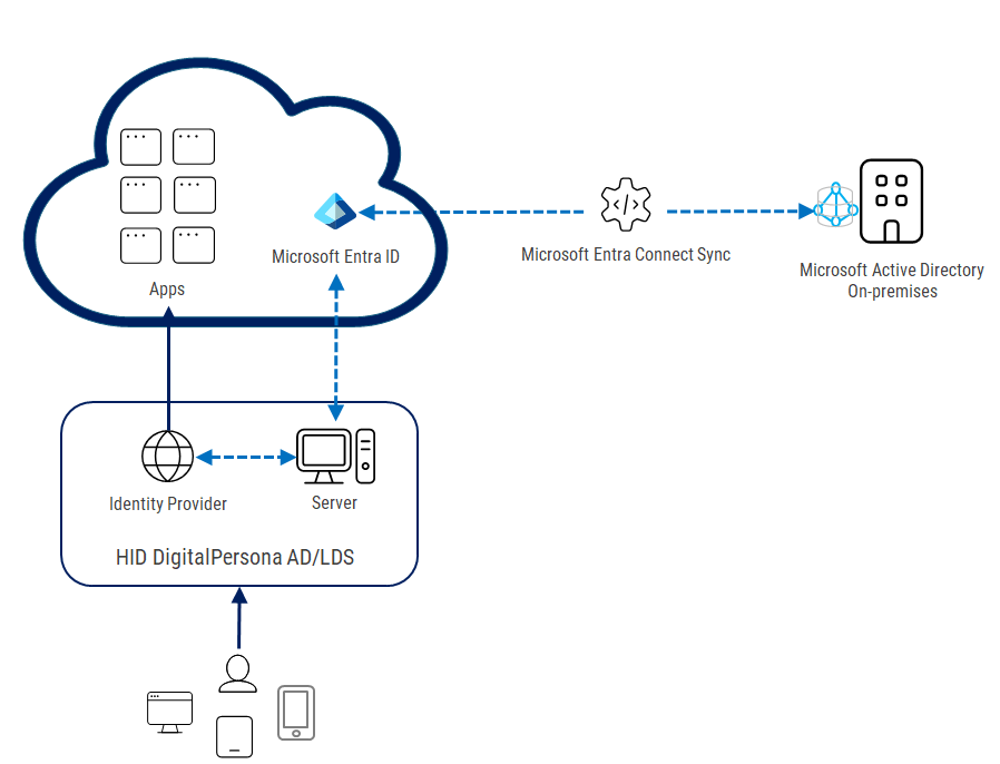 The following sections describe how to implement identity federation from the DigitalPersona Identity Provider (IdP) using Microsoft's hybrid identity solution to connect your on-premises Active Directory® (AD) identities with Microsoft® Entra® ID so users can access on-premise and cloud resources with a single identity.