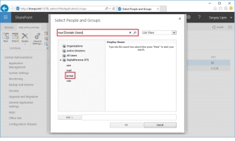 Select the desired claim under DigitalPersona STS in the left frame and enter a group or account name to grant access to in the Find text box at the top.