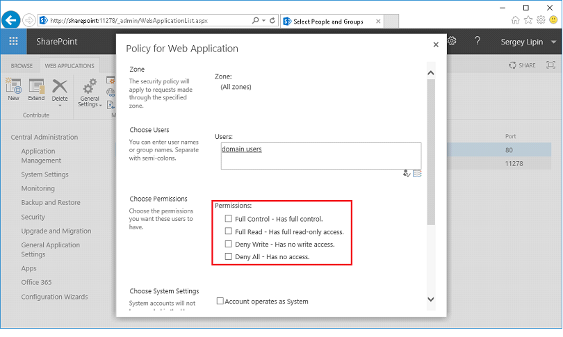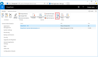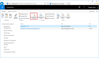 On the Manage Web Applications screen, select the web application that has the DigitalPersona STS authentication provider configured and click User Policy.