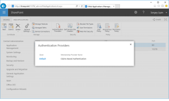 Select the desired SSL enabled web application in the list and click Authentication Providers: