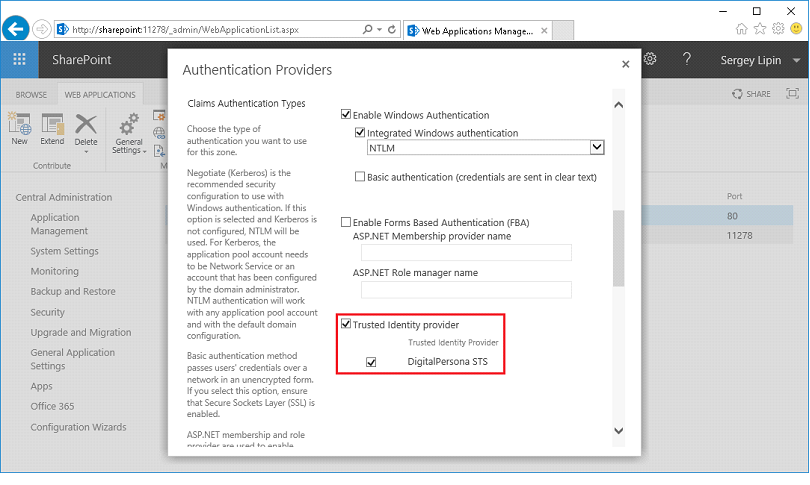 Scroll down to Claims Authentication Types and enable Trusted Identity Provider and DigitalPersona STS.