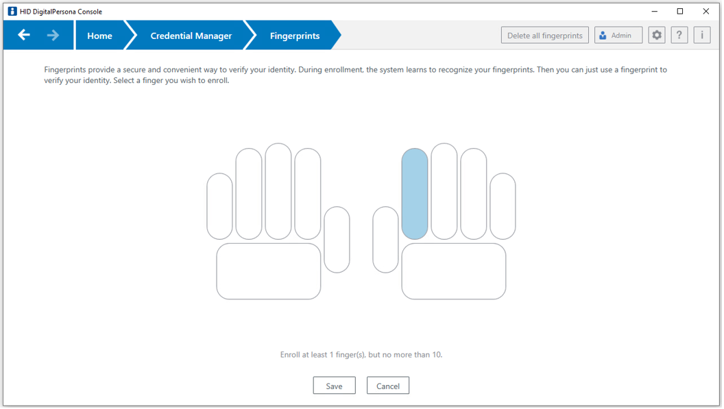 When enrollment is complete, the Fingerprints page redisplays with the enrolled finger highlighted.