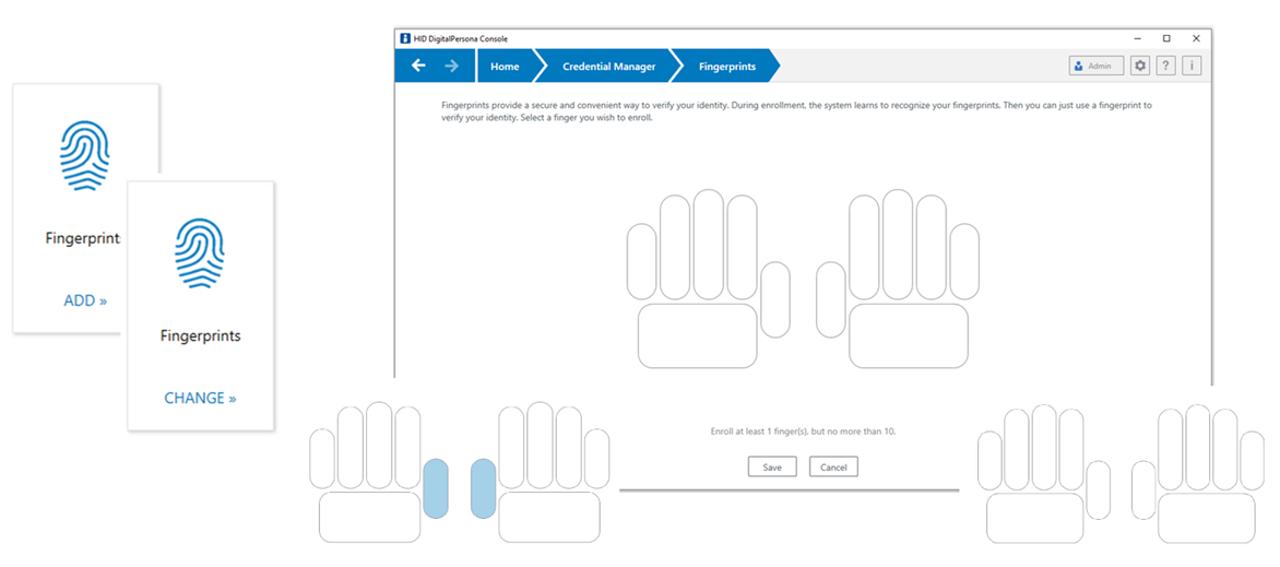 Note: The CHANGE option displays on the Fingerprints tile after the first fingerprint has been enrolled and saved.The Fingerprints page displays an outline of two hands. Fingers that have been previously enrolled are highlighted.