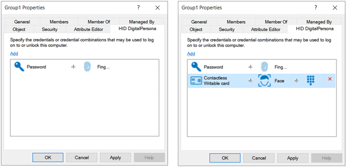In the HID DigitalPersona [group] Properties dialog, click Add to display the Edit dialog.