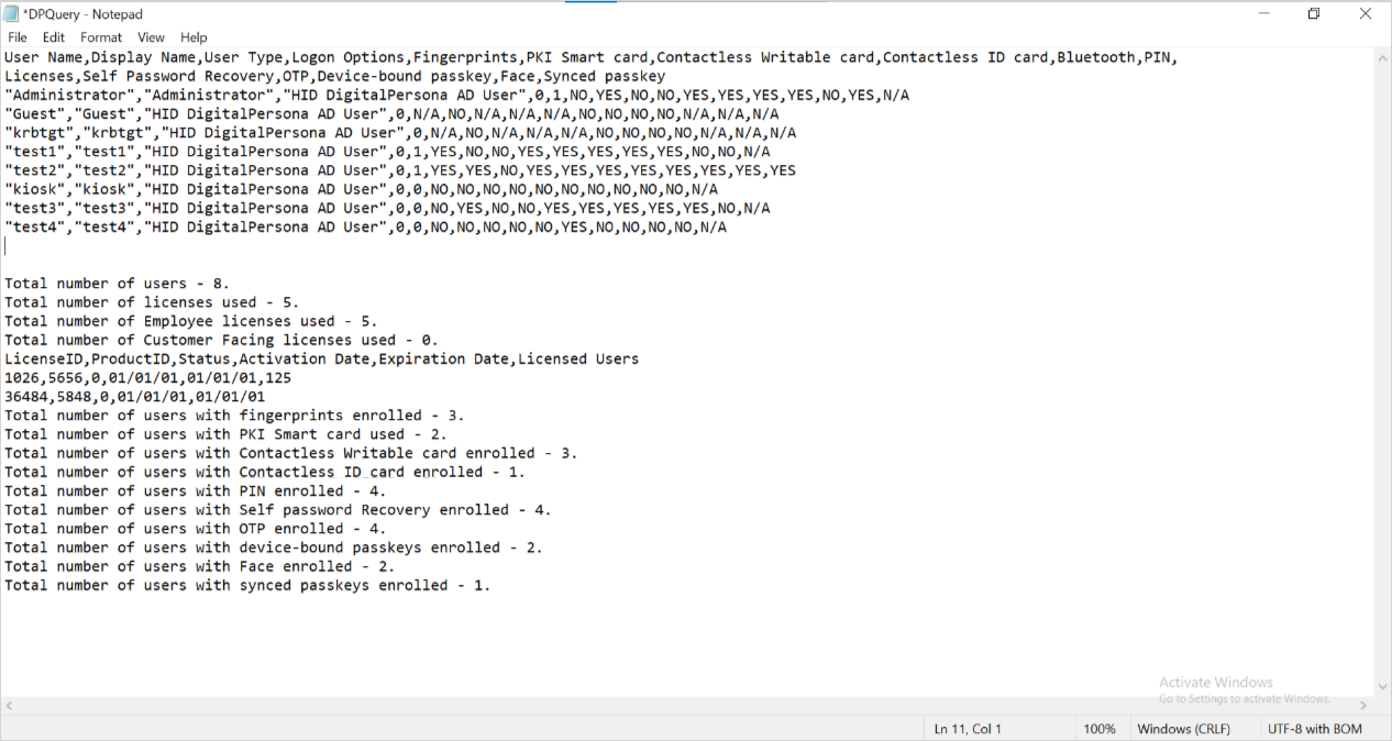 DPQuery.exe –noui –dn=”CN=Users,DN=DigitalPersona,DN=com” –lic