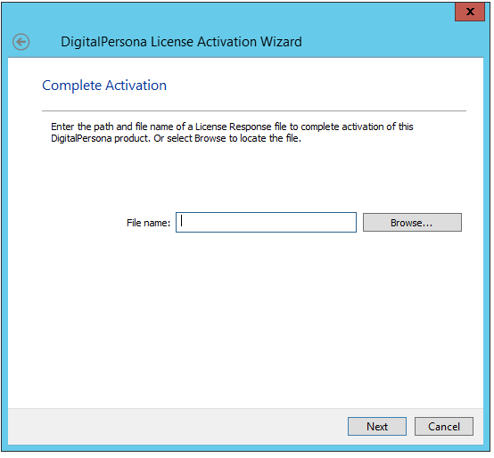 2. On the Complete Activation page, enter the path and file name of the License Activation Response file to complete activation of your DigitalPersona product. Or select Browse to locate the file.