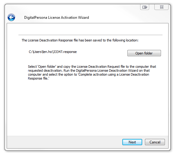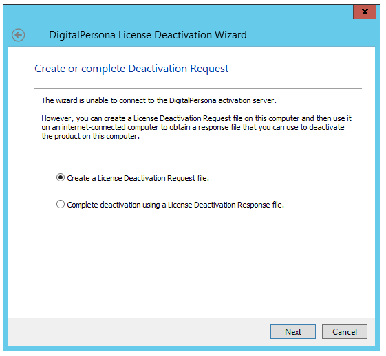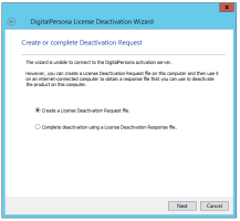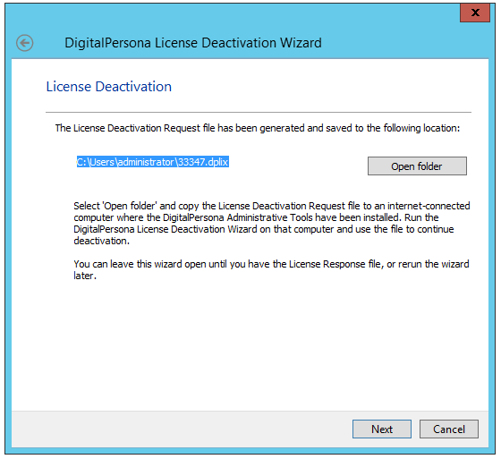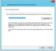 8. Copy the resulting License Deactivation Request (.dplix) file to a shared directory or device that can be accessed from a computer with an internet connection and the DigitalPersona Administrative Tools installed.