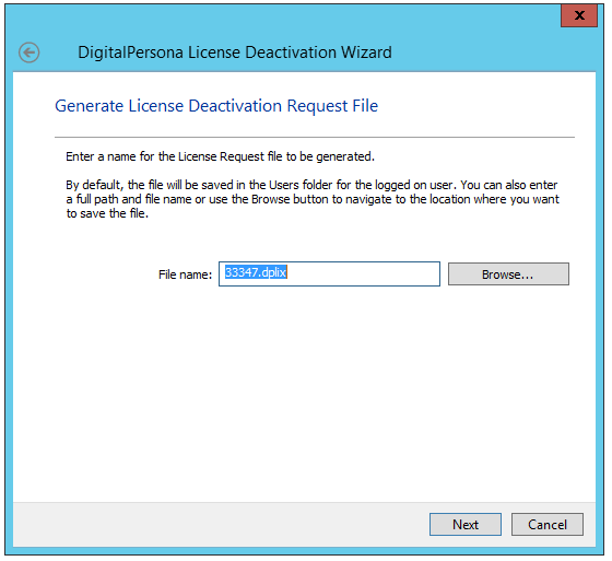 6. On the Generate License Deactivation Request File page, enter a name for the License Request file to be generated.