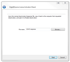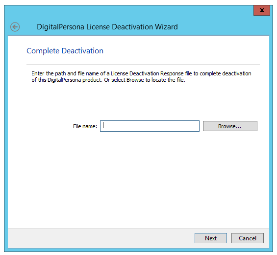 2. On the Complete Deactivation page, enter the path and file name of the License Deactivation Response file to complete deactivation of your DigitalPersona license. Or select Browse to locate the file.