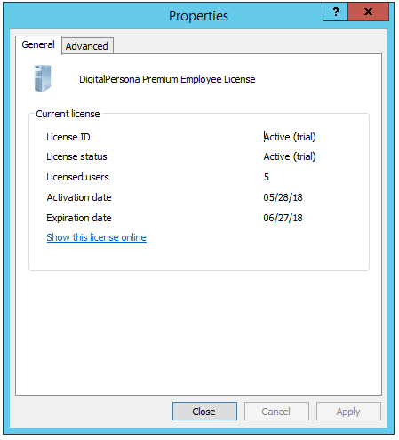 Your DigitalPersona solution comes with a 30-day Evaluation License for 10 users. Upon product activation with a purchased license, the evaluation license is hidden. If all licenses are deactivated, the Evaluation license will redisplay.